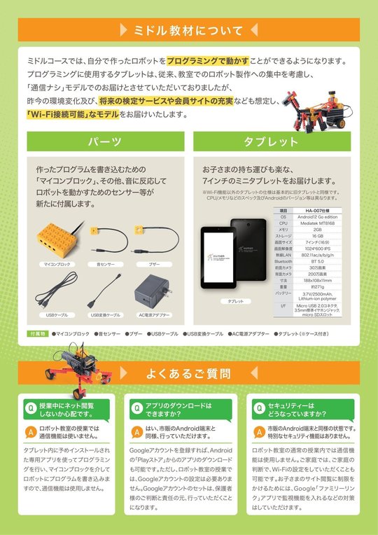 ベーシックコース以降、タブレット16000円 ミドルコース進級時(センサー類) 10230円 アドバンスコース進級時(センサー類) 10450円 |